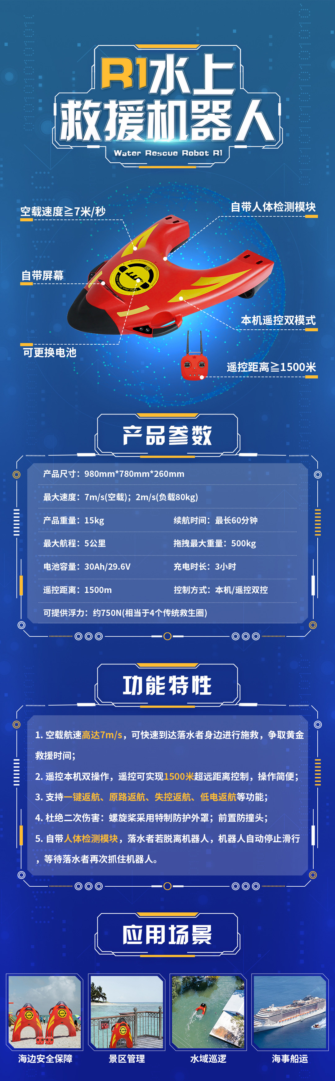 無人化水域救援可以應(yīng)用到多個行業(yè)里,比如,旅游業(yè)的景區(qū)管理、海邊安全保障、水域巡邏,運(yùn)輸業(yè)的海事船運(yùn),消防行業(yè)的抗洪救災(zāi),潛水打撈行業(yè)的水下搜尋及打撈、船體檢測等。當(dāng)中可應(yīng)用到上述場景的裝備有水上救援機(jī)器人、水上救援艇以及水下機(jī)器人。R1/R2水上救援機(jī)器人專注于水域環(huán)境中1-3人的緊急救援、水域巡邏,在日常的巡邏工作中,如果發(fā)現(xiàn)不慎落水者,救援隊可以隨時拋投R1/R2出發(fā),遙控操控,并以最快7.8m/s的速度,抵達(dá)落水者身邊;T1水上救援艇專注于4-6人大規(guī)模的水域救援,入水自動充氣識別,可以搭載對講、喊話、照明設(shè)備,遙控操控,在洪災(zāi)救援、內(nèi)河、輪渡等場景運(yùn)作高效;P1水下機(jī)器人專注于水下的搜尋、拍攝、打撈、檢查,具備鋁合金緊湊型機(jī)身,可以避免蛙人在寒冷天氣下的水下工作。