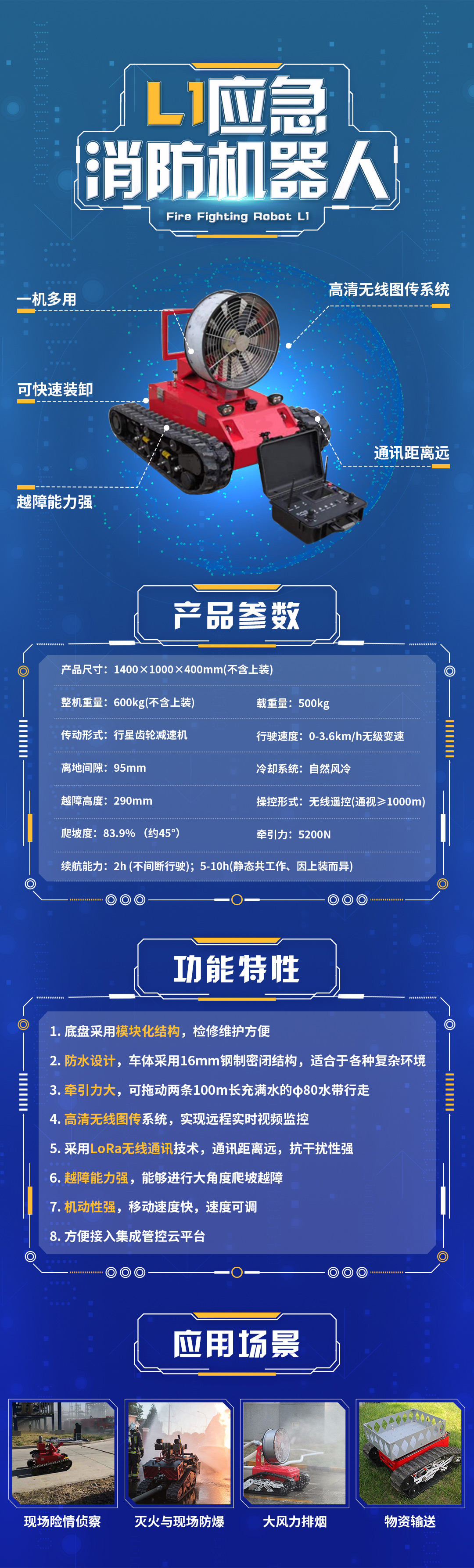 從19世紀(jì)末開始全球開始?xì)鉁厣?,平均氣溫上升?.3~0.6度,隨之而來的是一系列的環(huán)境災(zāi)害,而火災(zāi)就是其中一種。每年,在不管是成功營救或者是損失的數(shù)字背后,都是以一條條消防員/受害者生命所疊加而成的。而無人化消防救援解決方案卻能夠為此帶來低損失成本和高滅火救災(zāi)效率。L1應(yīng)急消防機(jī)器人,它能夠充當(dāng)消防員進(jìn)行現(xiàn)場險情偵察、緊急滅火、大風(fēng)力排煙、探測巡檢、物資輸送、現(xiàn)場防爆。