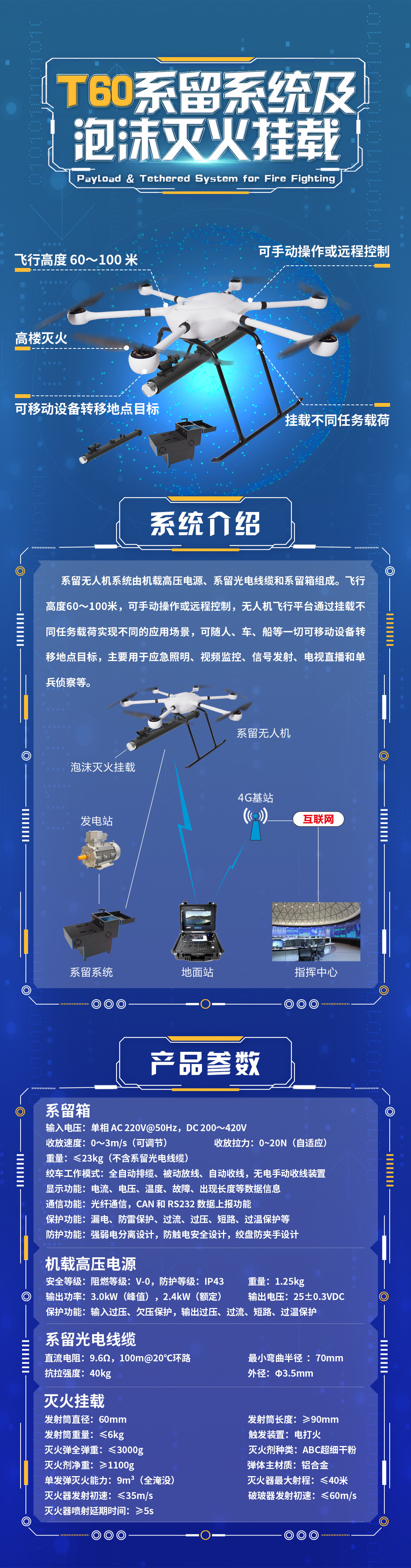 任務(wù)進(jìn)行時,高樓有65米高,著火點(diǎn)剛好位于該樓的最高樓,隨即應(yīng)急隊立即派出T60系留無人機(jī)進(jìn)行單兵偵察,系留無人機(jī)高度可以達(dá)到60-100米,搭載了泡沫滅火和高清攝像機(jī)云臺,可以一邊讓系留系統(tǒng)供電,讓其長時間飛行,一邊回傳室內(nèi)著火情況,同時也執(zhí)行著滅火的任務(wù)。畫面上看到該層樓辦公室因為位置的長地毯著火了,同時引燃了電腦設(shè)備和打印紙,應(yīng)該是在沒人發(fā)現(xiàn)的地方發(fā)生的,濃煙滾滾。但沒有觀察到具體的人員,判斷已經(jīng)基本撤離。隨后T60使用泡沫滅火掛載,發(fā)射ABC超細(xì)干粉,在消防員沒趕到前將火情盡可能控制。無人機(jī)連續(xù)工作了7分鐘,火苗已逐漸熄滅,現(xiàn)場工作人員也已趕到。無人機(jī)成功在應(yīng)急隊到達(dá)著火點(diǎn)之前協(xié)助滅火,降低風(fēng)險,本次疏散大樓380人,該單位涉及人數(shù)達(dá)到80人,均無傷亡報道。
