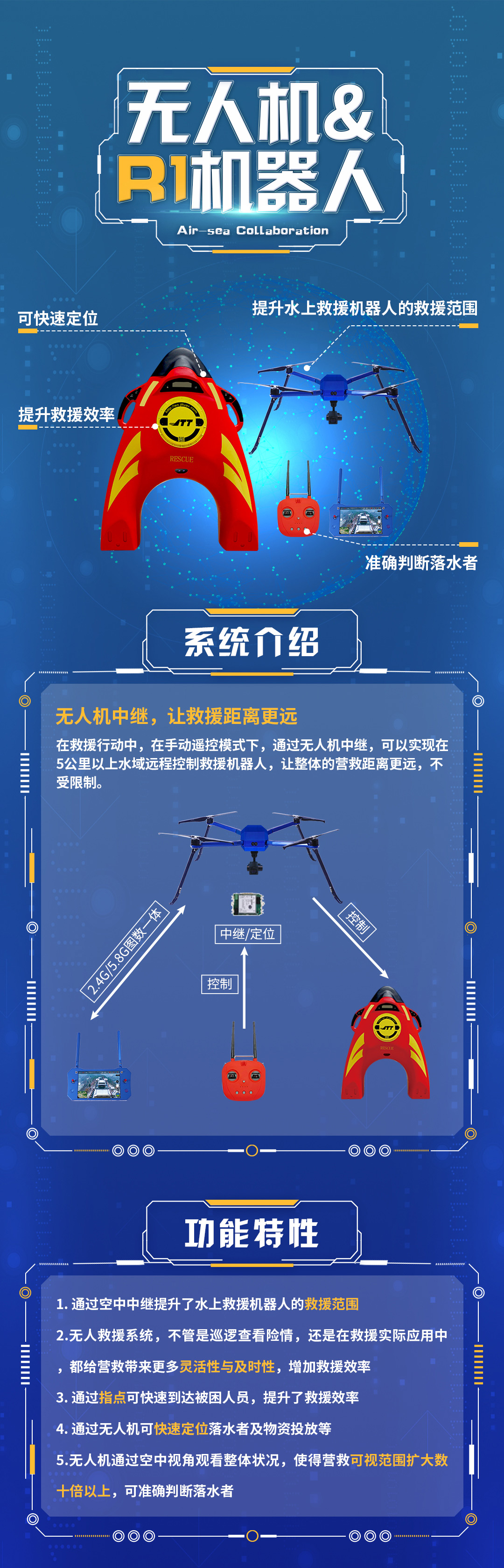 當(dāng)日,海岸警衛(wèi)隊在附近通過C85無人機(jī)進(jìn)行著空中俯視巡邏,搭配著30倍高清圖傳放大查看海域各個地方的異常點(diǎn),也搭配著救生包隨時準(zhǔn)備救援。警衛(wèi)隊在巡邏時忽然發(fā)現(xiàn)一個地方有異樣,放大看是兩名少年到了深水區(qū)掙扎著,似乎出現(xiàn)了溺水的狀態(tài),附近也剛好沒人,情況危急,但他們距離著警衛(wèi)隊有300m的范圍,那么怎樣同時救起兩個人呢?隨后警衛(wèi)隊出動了R1水上救援機(jī)器人,并開啟了中繼空海一體救援模式,R1跟隨無人機(jī)方向行駛,同時救援距離增加到了5km超遠(yuǎn)距離,不到1分鐘的時間,機(jī)器人和無人機(jī)就到達(dá)了現(xiàn)場,無人機(jī)拋投了救生包,救生包展開,一位青年隨即抓住得以呼吸,而另外一位則抓住了R1,兩個人都同時得到了生還的機(jī)會。隨后,有救生包者則抓住了另外一個人,一起隨著R1回到了岸上。無人化的救援讓他們在沒有任何人幫助下留下了一線希望。