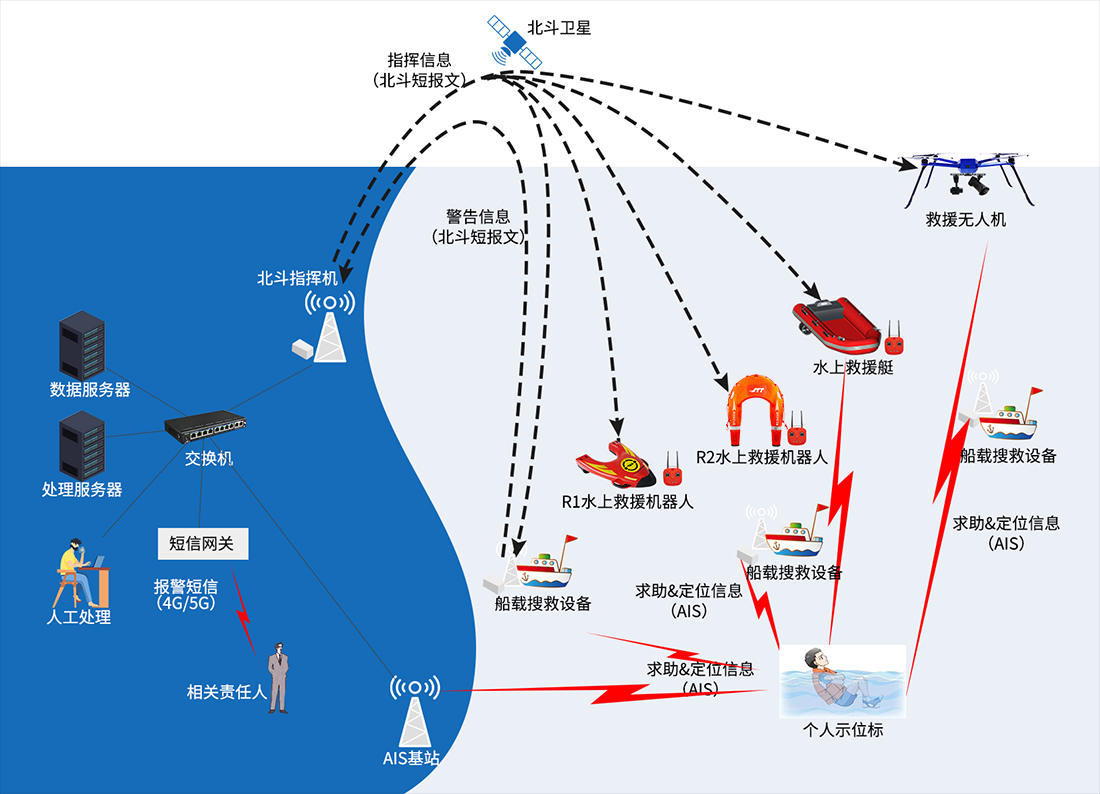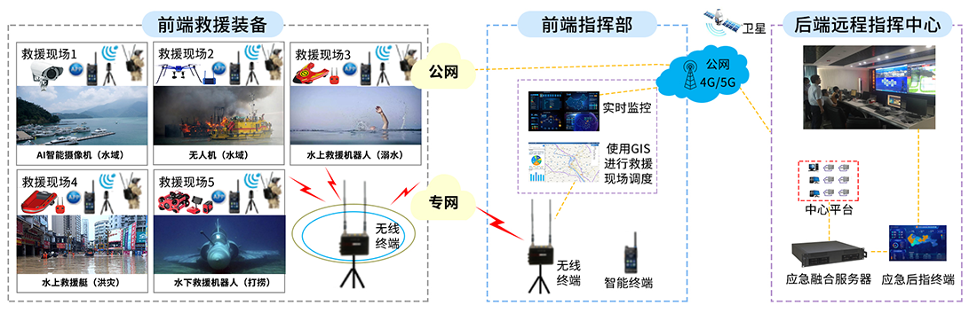 JTT水域救援系統(tǒng)是針對(duì)上述水域救援調(diào)度存在的問(wèn)題,自主研發(fā)的一套集后端遠(yuǎn)程指揮中心、前端指揮部及前端救援裝備于一體的水域救援系統(tǒng),后端指揮中心應(yīng)急指揮平臺(tái)分級(jí)管理及調(diào)度,前方救援現(xiàn)場(chǎng)數(shù)據(jù)的上傳并及時(shí)進(jìn)行指令的下達(dá),從而提高決策效率和救援效率。所有前端智能設(shè)備均與前端指揮部及后端指揮中心通過(guò)無(wú)線進(jìn)行通信,前端遠(yuǎn)程指揮中心根據(jù)其所接收的智能設(shè)備數(shù)據(jù)統(tǒng)一進(jìn)行調(diào)度,指揮救援工作有序進(jìn)行。