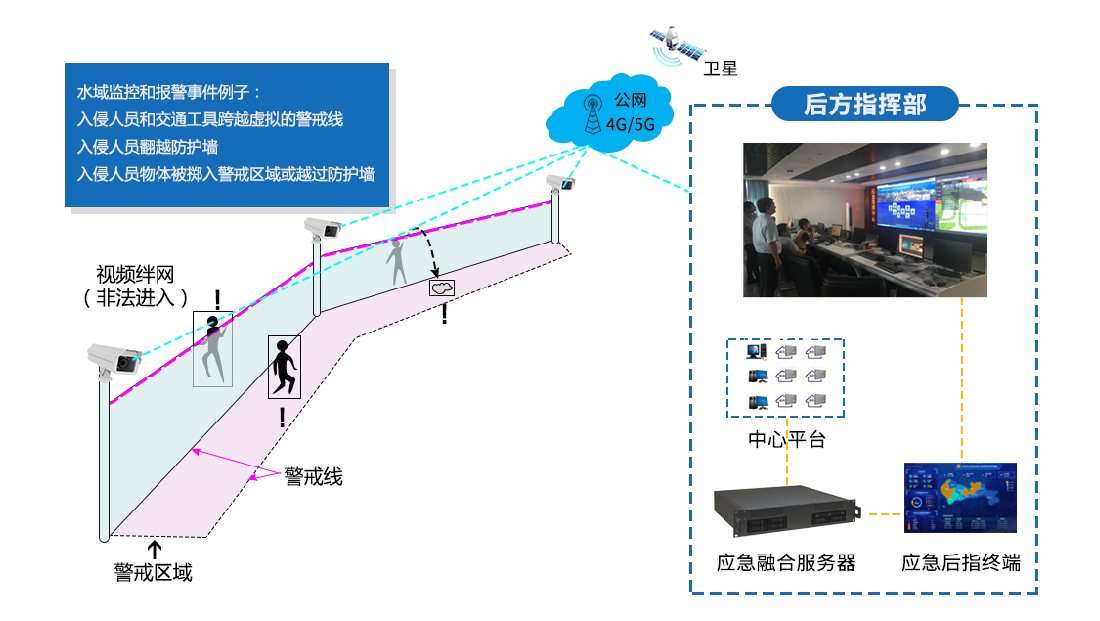 針對(duì)固定水域周邊部署AI智能攝像機(jī),對(duì)不適宜人去游泳容易發(fā)生意外事故的區(qū)域設(shè)置警戒區(qū)域,無(wú)人值守的情況下,在視頻畫(huà)面中設(shè)置虛擬警戒區(qū)(單線、雙線、矩形或者不規(guī)則多邊形),判別人員入侵,在后端指揮系統(tǒng)觸發(fā)報(bào)警。還可聯(lián)動(dòng)語(yǔ)音設(shè)備,進(jìn)行語(yǔ)音呼叫。若出現(xiàn)溺水情況后端指揮中心立