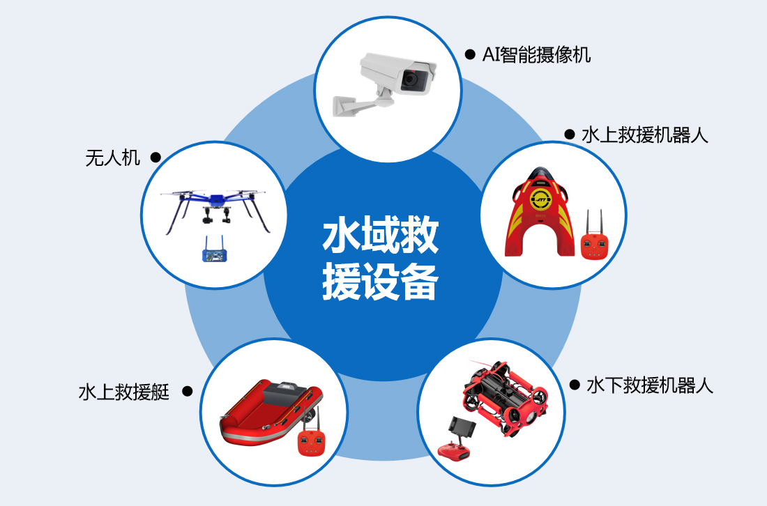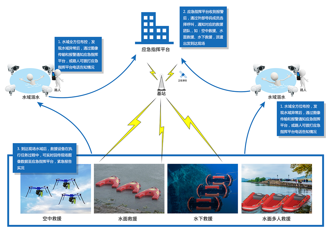 水域救援系統(tǒng)前端智能救援設(shè)備主要包括水域AI智能攝像機(jī)、空中救援無(wú)人機(jī)、水上救援機(jī)器人、水上救援艇、水下救援機(jī)器人等,組成從空中、水面、水下立體化救援系統(tǒng),應(yīng)對(duì)不同的救援場(chǎng)景需求,所有前端智能救援設(shè)備均與前端指揮部及后端指揮中心組成一體,聽(tīng)命于應(yīng)急管理平臺(tái)的統(tǒng)一調(diào)度,讓指揮救援工作有序、有效地進(jìn)行。