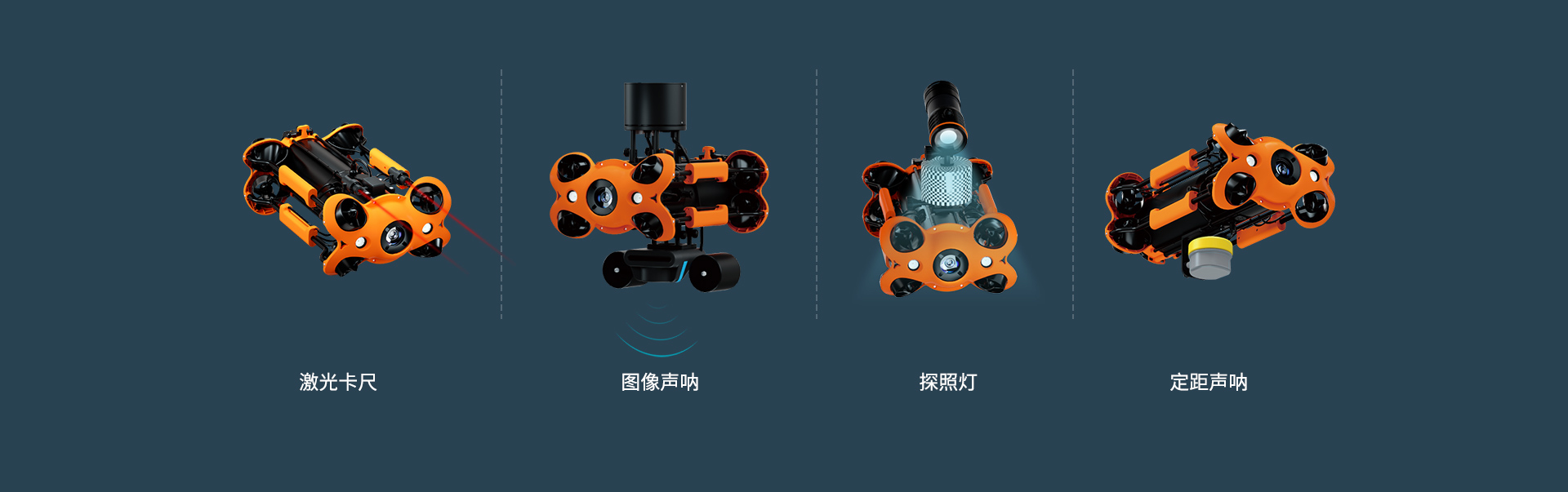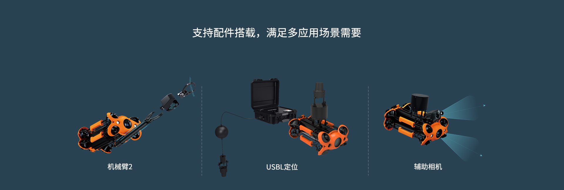 支持配件搭載,滿足多應(yīng)用場(chǎng)景需要:機(jī)械臂、USBL定位、輔助相機(jī)、圖像聲吶、激光卡尺、探照燈、定距聲吶;