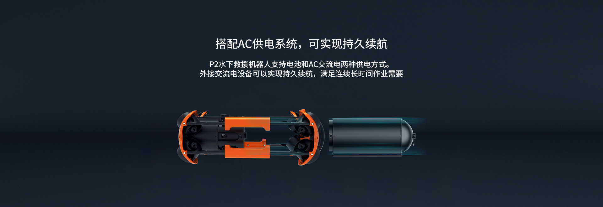 搭配AC供電系統(tǒng),可實(shí)現(xiàn)持久續(xù)航:P2水下救援機(jī)器人支持電池和AC交流電兩種供電方式。外接交流電設(shè)備可以實(shí)現(xiàn)持久續(xù)航,滿足連續(xù)長(zhǎng)時(shí)間作業(yè)需要;