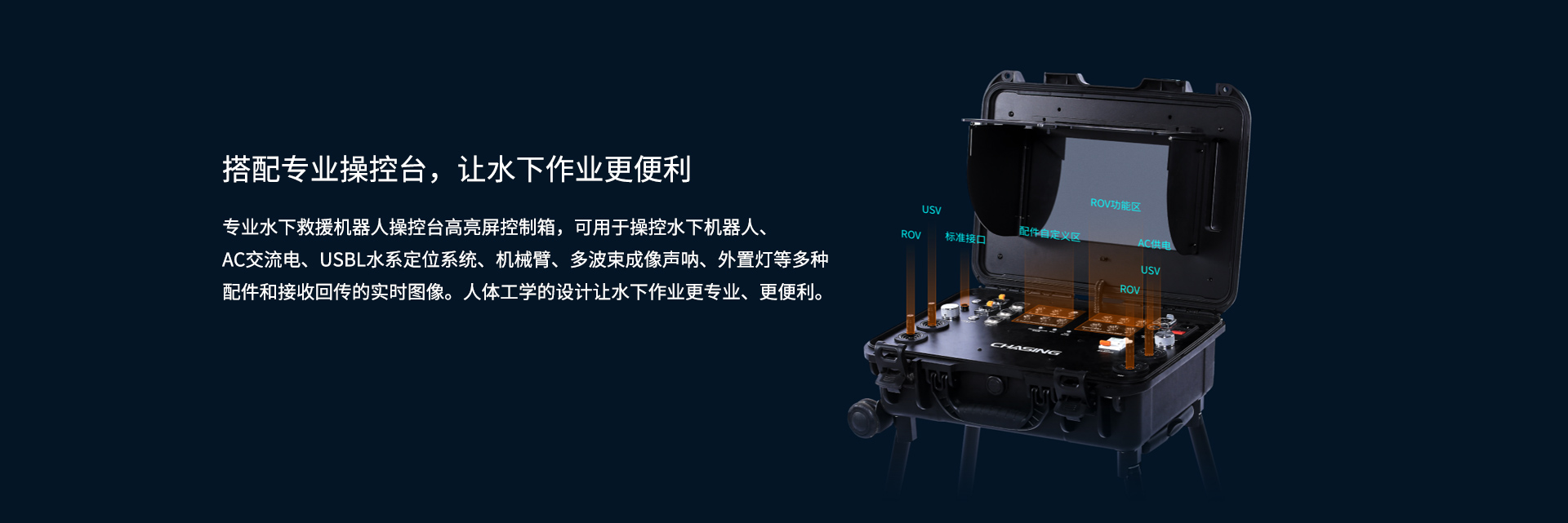 搭配專業(yè)操控臺(tái),讓水下作業(yè)更便利:專業(yè)水下救援機(jī)器人操控臺(tái)高亮屏控制箱,可用于操控水下機(jī)器人、AC交流電、USBL水系定位系統(tǒng)、機(jī)械臂、多波束成像聲吶、外置燈等多種配件和接收回傳的實(shí)時(shí)圖像。人體工學(xué)的設(shè)計(jì)讓水下作業(yè)更專業(yè)、更便利。