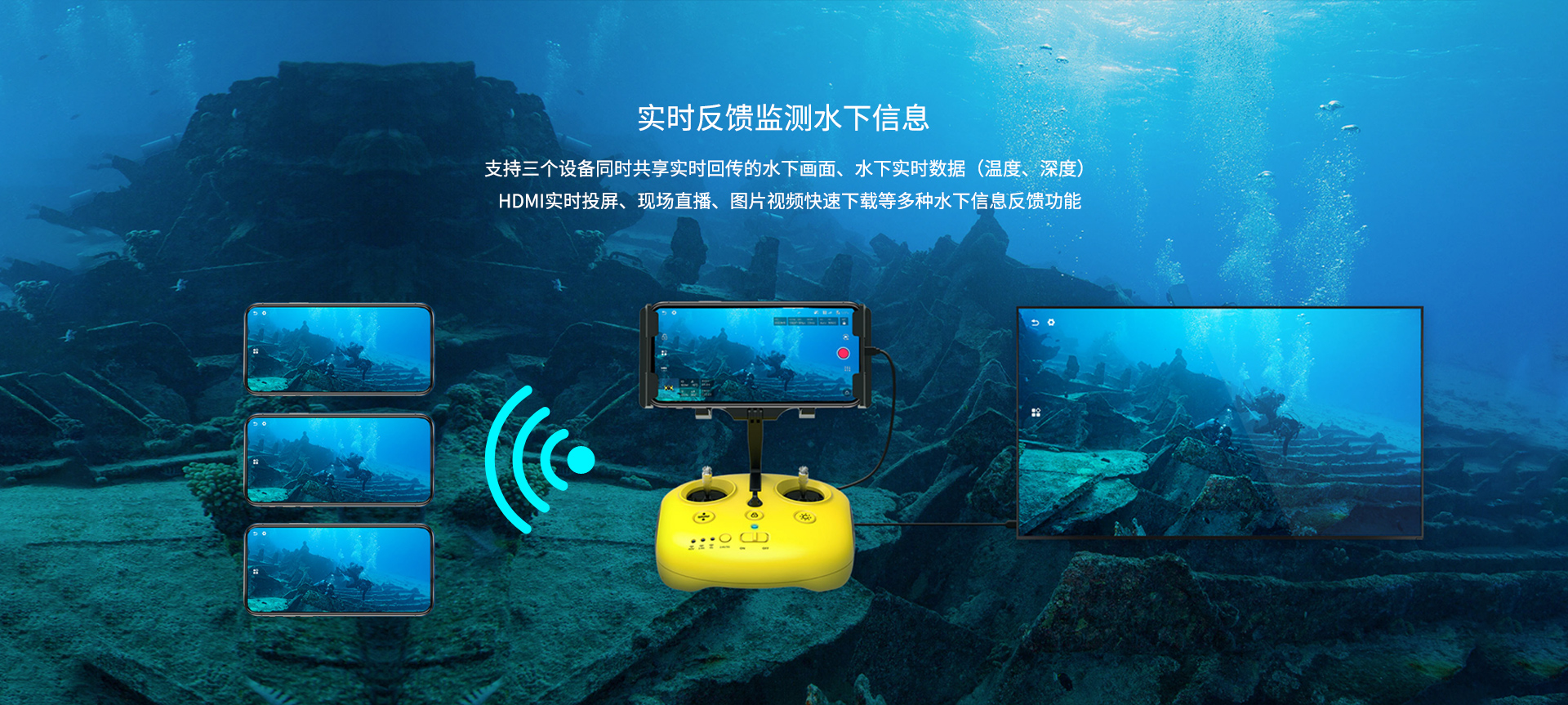 實(shí)時(shí)反饋監(jiān)測(cè)水下信息:支持三個(gè)設(shè)備同時(shí)共享實(shí)時(shí)回傳的水下畫面、水下實(shí)時(shí)數(shù)據(jù)(溫度、深度)HDMI實(shí)時(shí)投屏、現(xiàn)場(chǎng)直播、圖片視頻快速下載等多種水下信息反饋功能。